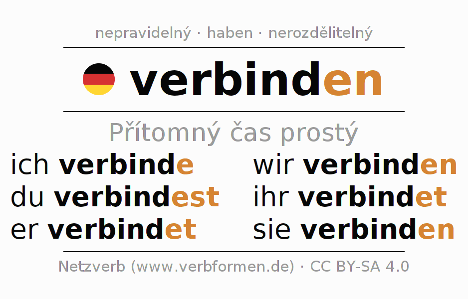 Tvary časování verbinden (spojit, obvazovat) v přítomném čase jsou: ich verbinde, du verbindest, er verbindet, wir verbinden, ihr verbindet, sie verbinden