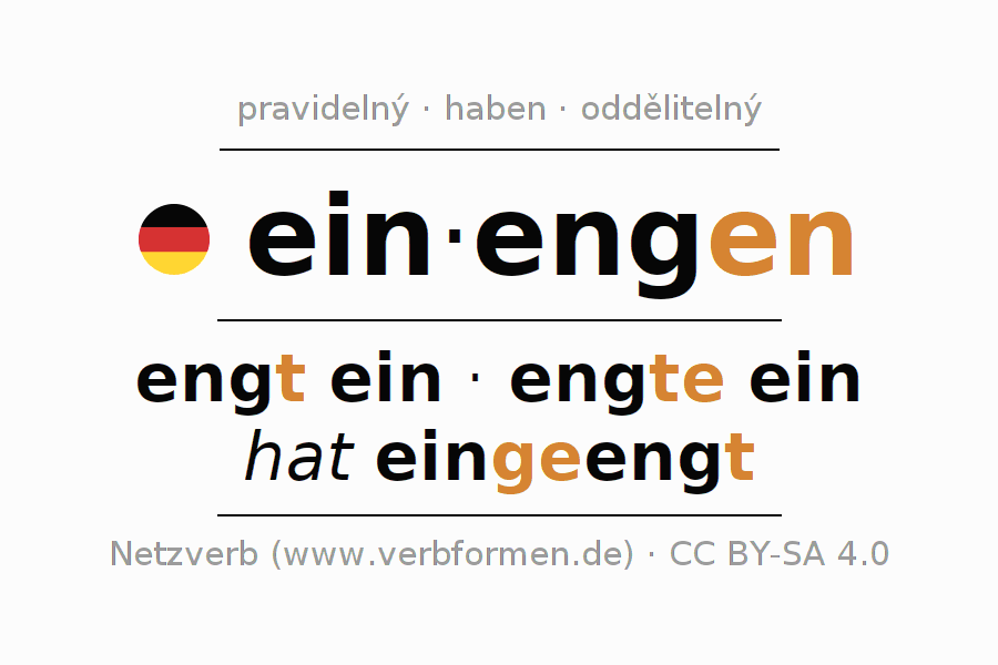 Tvary časování slovesa einengen (zúžit, omezit) v konjunktivu II jsou: ich engte ein, du engtest ein, er engte ein, wir engten ein, ihr engtet ein, sie engten ein