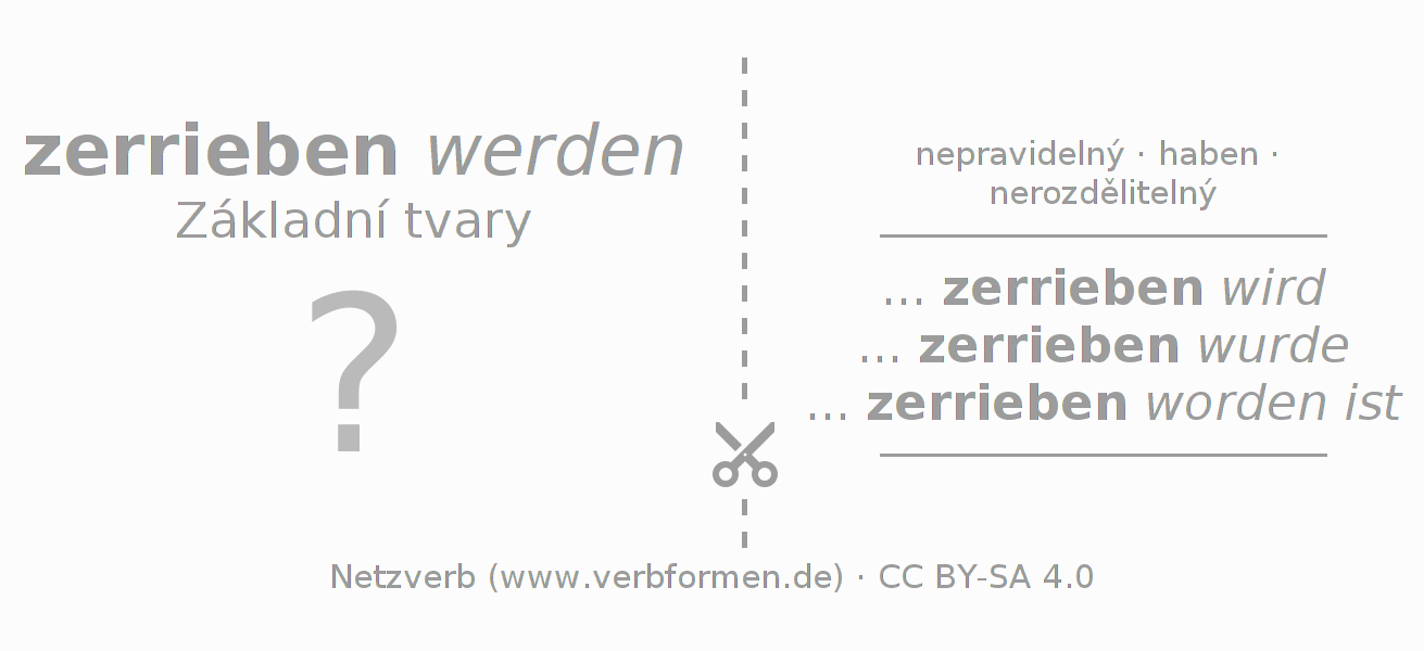 Slovesné tabulky přehledně shrnují všechny tvary slovesa zerreiben v jedné tabulce.